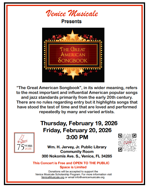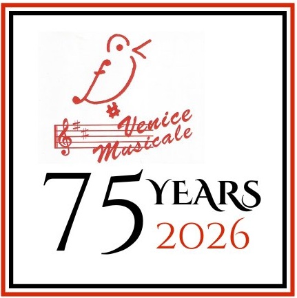 Thank you for your continuing support of Venice Musicale over this landmark season—our 75th anniversary year! We are presenting to you a varied and inspiring array of Free concerts, offering our audiences a wide range of musical styles from classical through pop standards, Americana, spiritual, and Broadway. Included in our performances from October through April is music both vocal and instrumental, presented by members, guest artists, and student scholarship winners. Whether you attend an Encore Chorus performance, enjoy one of our Monthly Concerts, or delight in the four-hand piano artistry of the Suncoast Duo Pianists, we invite you to enjoy our musical offerings and continue to show your support of our Scholarship Program by your generous donations.